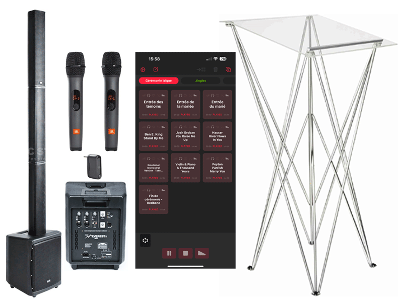 - Une tablette Apple appairée en bluetooth avec vos musiques prévues pour la cérémonie, déjà installées sur une application professionnelle dédiée (utilisation simplissime).